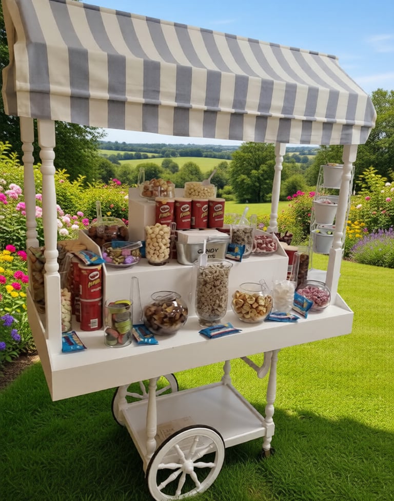 Our Candy Cart offers tiered shelving for incredible looking displays. Great for any occasion where you want to display gifts for your guests, or you want to sell your goods from a unique table top.